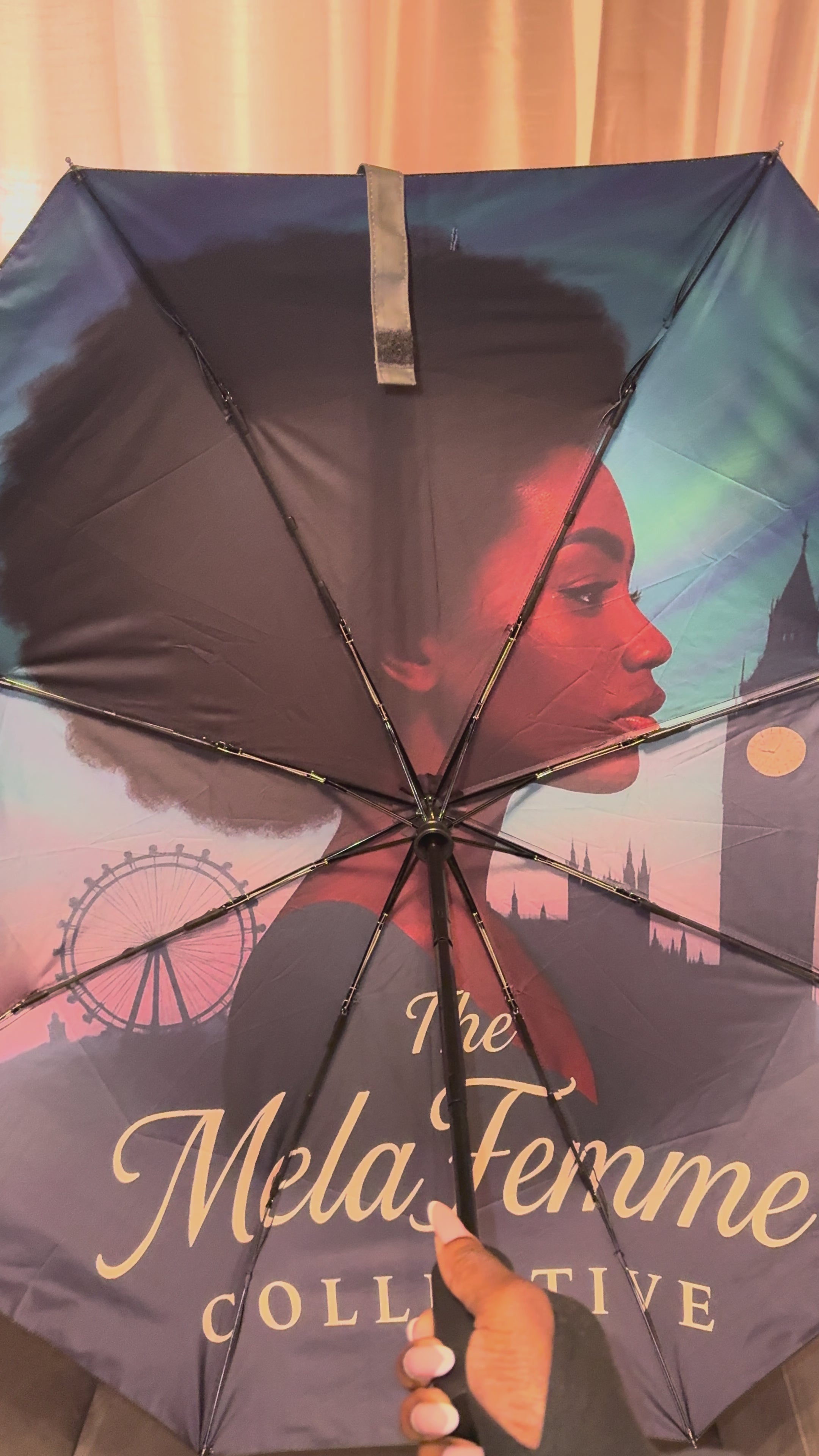 This small TMC Branded Umbrella keeps you dry with an edge-to-edge beautiful canopy image of our gorgeous black woman with her afro with the London skyline to look up at and forget your surroundings. Includes the external cover with TMC logo (matching the external umbrella TMC logo), adding a distinctive subtle touch amongst your other brollies. Perfect for handbag use on the go, it adds a playful touch to rainy days.